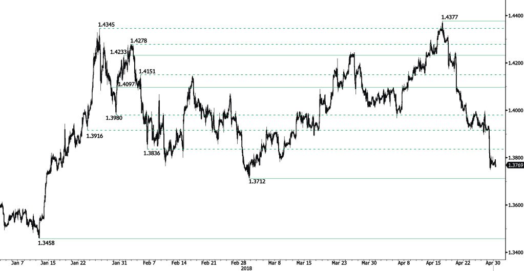 GBP/USD is trading lower, approaching hourly support at 1.3712 (01/30/2018 low) and heading along the 1.3745 range. Hourly support at 1.3836 (06/02/2018) is now broken. The pair is currently trading at March low. Hourly resistance at 1.4097 (29/01/2018 high) remains. The technical structure suggests further short-term decrease.