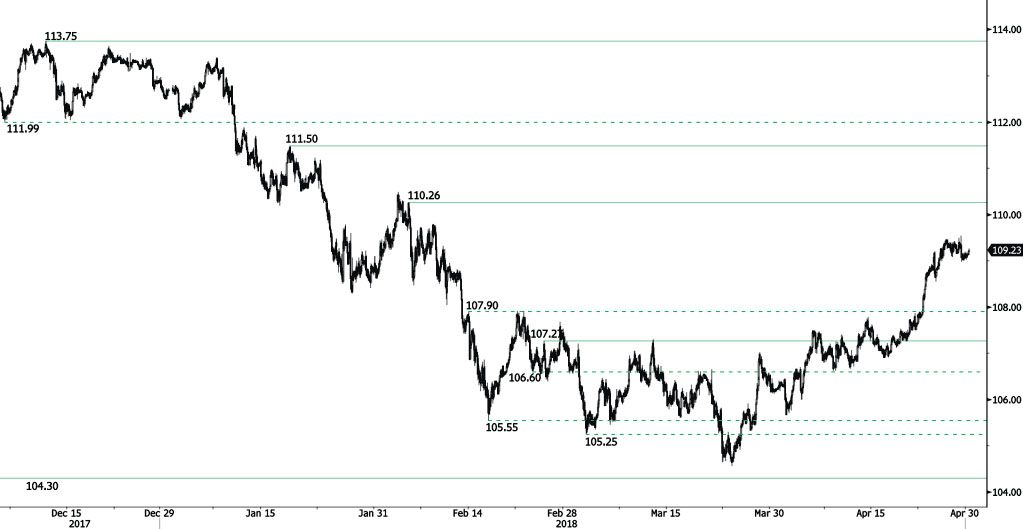 USD/JPY bullish pattern starts back, currently trading at 109.29 and heading along the 109.40 range. The bearish pattern started in January 2018 is weakening. Hourly support and resistance are given at 107.27 (25/02/2018 low) and 110.26 (05/02/2018 high). The short-term technical structure suggests short-term downward moves.