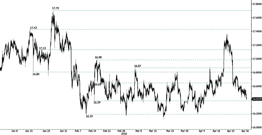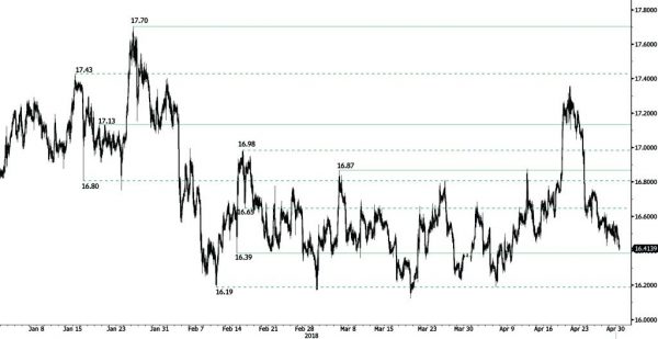 Silver is decreasing further, approaching resistance at 16.39 (14/02/2018 low). Hourly resistance at 16.87 (06/03/2018 high) is distanced. The technical structure suggests further short-term decrease.
