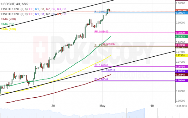 The bullish momentum that began mid-February has guided the USD/CHF exchange rate towards the upper boundary of a dominant ascending channel. This mark 8.59% increase in price during the last two months. The currency pair has breached a resistance formed by the monthly pivot point at 0.9952.