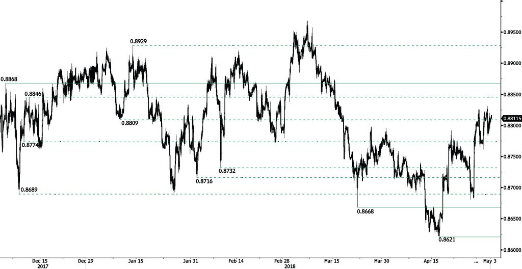 EUR/GBP is bouncing off from 0.8783 (02/05/2018 low), heading along the 0.8817 range. EUR/GBP bearish pattern started in March is weakening. Hourly support and resistance are given at 0.8668 (22/03/2018 low) and 0.8868 (05/12/2017 high). The technical structure suggests short-term upward moves.