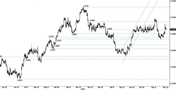 USD/CAD is decreasing after reaching 1.2925 (15/05/2018 high), heading along 1.2845. Hourly support and resistance are given at 1.2621 (23/02/2018 low) and 1.3125 (19/03/2018 high). The technical structure suggests short-term downward moves.