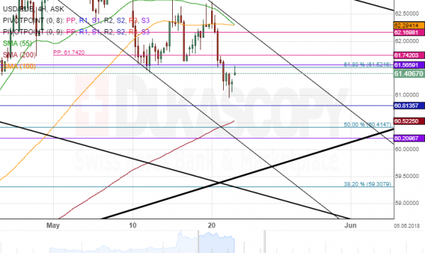 The USD/RUB pair has been more following simple channel trend lines than pivot points SMAs or Fibonacci retracement levels. Moreover, recently the 61.00 mark has been acting as a lone psychological level of significance.