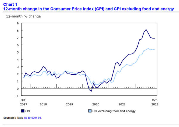 Canada CPI was unchanged at 6.9% yoy in October, slightly below expectation of 7.0% yoy. Excluding food and energy, prices slowed slightly from 5.4% to 5.3% yoy.