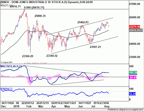 At this time of writing, DOW is down -0.9% or -2340 points. Focus in on 25120.07 support. As long as it holds, recent bullish run from 23997.21 is still on course for 25800.35 resistance. But a firm break there should indicate near term reversal.