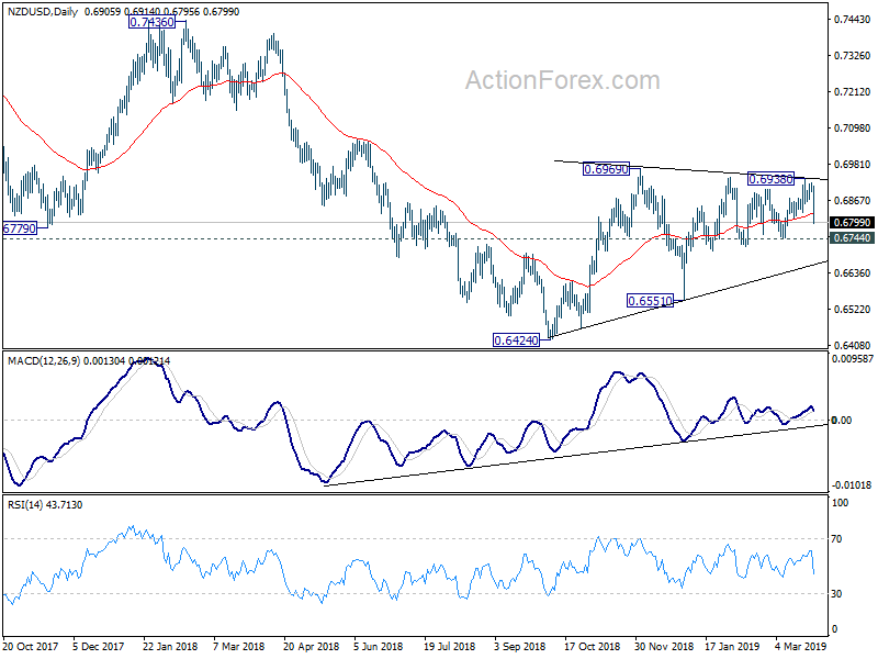 With today’s sharp fall, the first line of defense for NZD/USD is now on 0.6744 support. Break there will raise the chance that corrective pattern from 0.6424 is completed and bring deeper decline to 0.6424/6551 support zone.