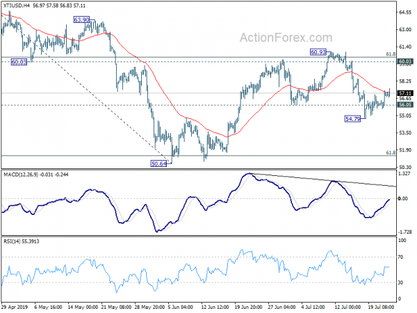 WTI’s fall to 54.79 was deeper than expected and broke 56.05 support. For now price actions from 60.93 are seen as correcting the rise from 50.64 to 60.69. Such correction should extend further for a while. Hence, current recovery from 54.79 should be limited below 60.93. Another fall through 54.79 is in favor but should be contained well above 50.64 low.
