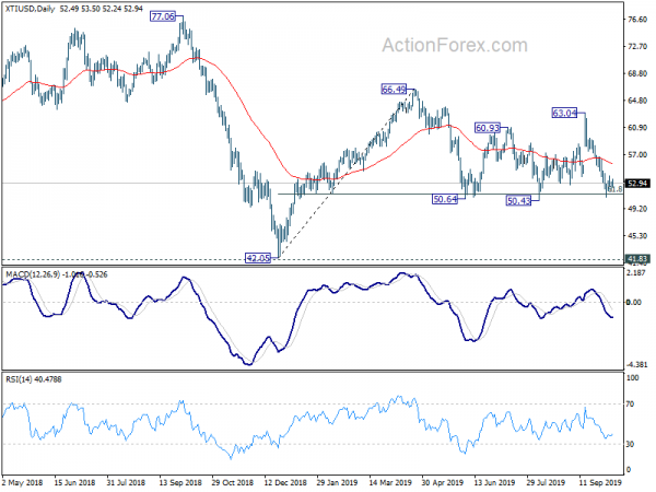 WTI crude oil is steady after the release. Decline from 63.04 lost momentum ahead of 50.43 support. This level is also close to 61.8% retracement of 42.05 to 66.49 at 51.38, as well as 50 psychological level. Thus, we’d expect stronger support from there to bring rebound, to extend medium term trading. On the upside, break of 54.71 will target 63.04 resistance.