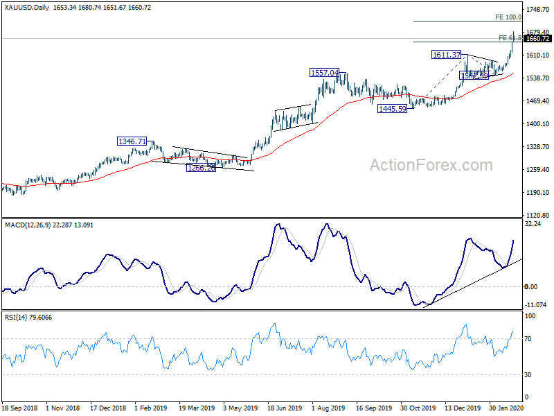 Gold surges to as high as 1680.74 today on concerns of global coronavirus outbreak. 61.8% projection of 1445.59 to 1611.37 at 1547.49 at 1649.94 was taken out with ease. There is no sign of topping yet and near term outlook will remain bullish as long as 1611.37 resistance turned support holds. Next near term target is 100% projection at 1713.27.