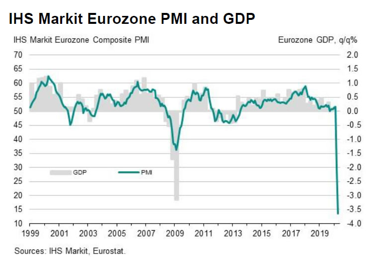 “Our model which compares the PMI with GDP suggests that the April survey is indicative of the eurozone economy contracting at a quarterly rate of approximately 7.5%. With large swathes of the economy likely to remain locked down to contain the spread of COVID-19 in coming weeks, the second quarter looks set to record the fiercest downturn the region has seen in recent history.
