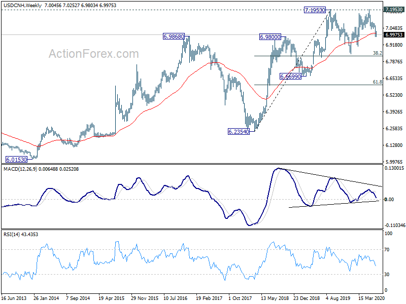 USD/CNH’s fall from 7.1961 is in progress. Such decline is seen as the third leg of the medium term sideway pattern from 71.953. While deeper decline could be seen, strong support should be provided by 6.8452, which is close to 38.2% retracement of 6.2354 to 7.1935 at 6.8286, to contain downside to bring rebound. Break of 7.0970 resistance will suggests that the decline has completed.