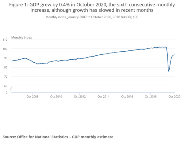 UK GDP grew 0.4% mom in October, slightly below expectation of 0.5% mom. That’s, nonetheless, the sixth consecutive monthly increase. GDP was 23.4% higher than the trough in April, but -7.9% below the level in pre-pandemic February.