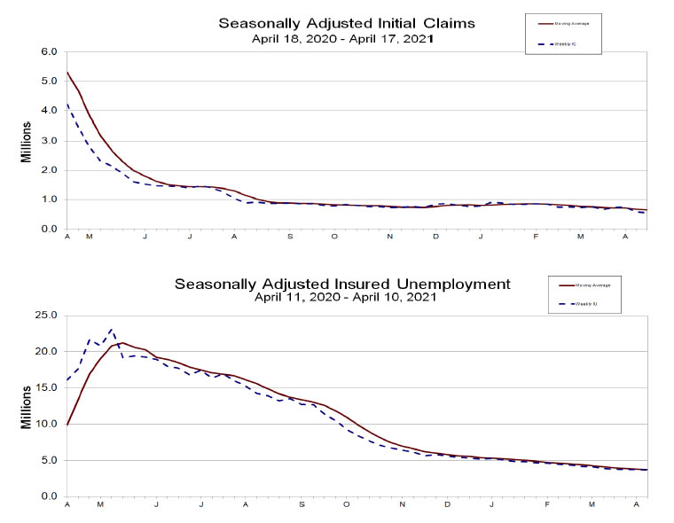 Continuing claims dropped -34k to 3674k in the week ending April 10, lowest since March 21, 2020. Four-week moving average of continuing claims dropped -42k to 3713k, lowest since March 28, 2020.