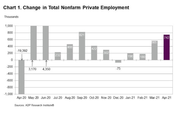 “The labor market continues an upward trend of acceleration and growth, posting the strongest reading since September2020,” said Nela Richardson, chief economist, ADP. “Service providers have the most to gain as the economy reopens, recovers and resumes normal activities and are leading job growth in April. While payrolls are still more than 8 million jobs short of pre-COVID-19 levels, job gains have totaled 1.3 million in the last two months after adding only about 1 million jobs over the course of the previous five months.”