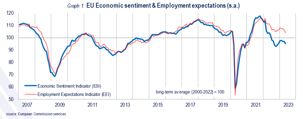 EU ESI dropped from 97.1 to 95.1. EEI dropped from 106.2 to 104.0. EUI dropped from 21.8 to 21.3. Amongst the largest EU economies, the ESI deteriorated in Spain (-3.0), Germany (-2.9), Italy (-2.3) and the Netherlands (-1.5), whereas it improved in Poland (+1.9) and France (+1.5).