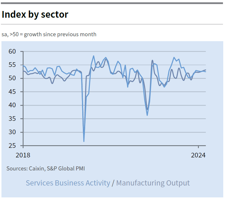 China’s Caixin PMI Services for April, while dipping slightly from 52.7 to 52.5 as expected, maintains a growth streak for the 16th consecutive month. The sector sees robust expansion in new business, marking its fastest pace in nearly a year. Business confidence also reaches its peak for the year so far. PMI Composite, which edged up from 52.7 to 52.8, reached its highest level since May 2023