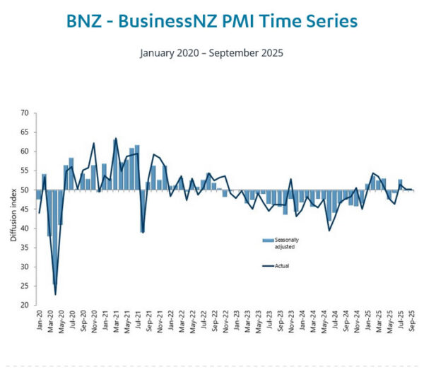 New Zealand’s BNZ Performance of Manufacturing Index held steady at 49.9 in September, marking another month of contraction and remaining below its long-term average of 52.4.