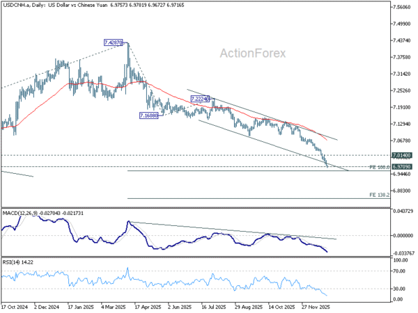 USD/CNH, meanwhile, is pressing key support near the 2024 low at 6.979. The downtrend from 7.4287 remains intact, though a critical Fibonacci level lies just ahead. That level sits at the 100% projection of 7.4287 to 7.1608 from 7.2224 at 6.9545. Strong support is expected there to trigger at least a corrective rebound. Firm break above 7.0140 resistance will signal short-term bottoming and opening a move back toward 55 D EMA (now at 7.0692).