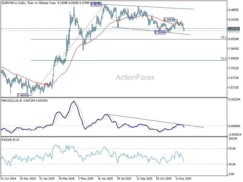 Technically, EUR/CNH’s break below 8.2040 support signals that the rebound from 8.1660 has likely completed at 8.3004. That opens the door for a deeper fall toward 8.1660, with a firm break there extending the broader downtrend from 8.4638. In this case, next target is 38.2% retracement of 7.4886 to 8.4638 at 8.0913.