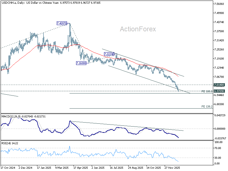 USD/CNH, meanwhile, is pressing key support near the 2024 low at 6.979. The downtrend from 7.4287 remains intact, though a critical Fibonacci level lies just ahead. That level sits at the 100% projection of 7.4287 to 7.1608 from 7.2224 at 6.9545. Strong support is expected there to trigger at least a corrective rebound. Firm break above 7.0140 resistance will signal short-term bottoming and opening a move back toward 55 D EMA (now at 7.0692).