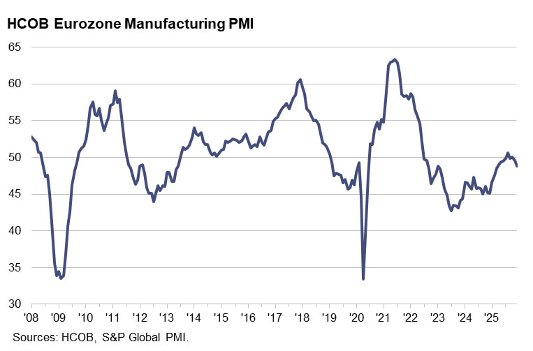 Input prices rose for a second consecutive month despite falling energy prices, driven instead by sharp gains in industrial metals and lingering supply-chain frictions. With delivery times lengthening and pricing power limited, the outlook remains challenging, leaving fiscal support as a key hope for reviving Eurozone manufacturing momentum in 2026.