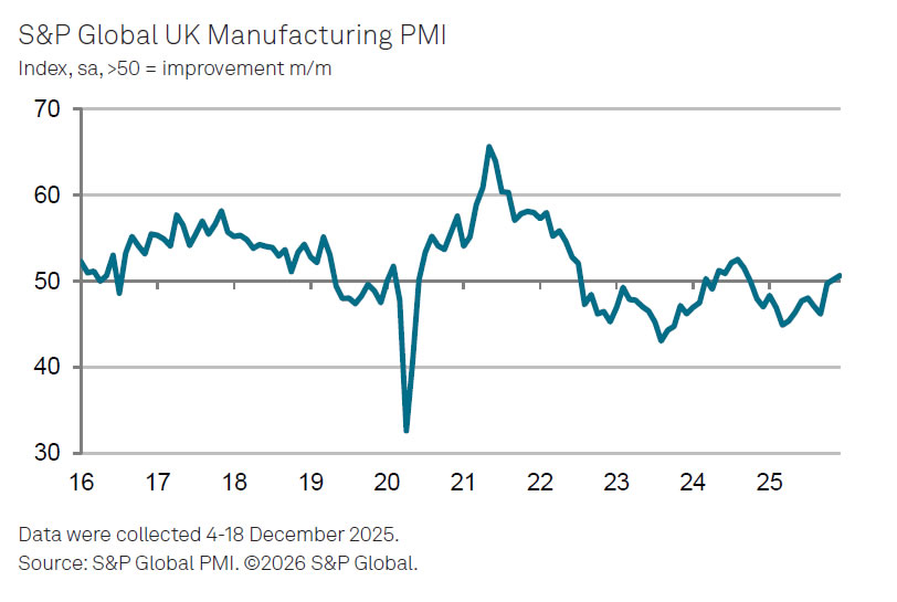 UK PMI Manufacturing was finalized at 50.6 in December, up from November’s 50.2 and marking a 15-month high. The reading confirmed continued expansion, though it was revised lower from the initial estimate of 51.2, tempering the strength of the signal heading into 2026.