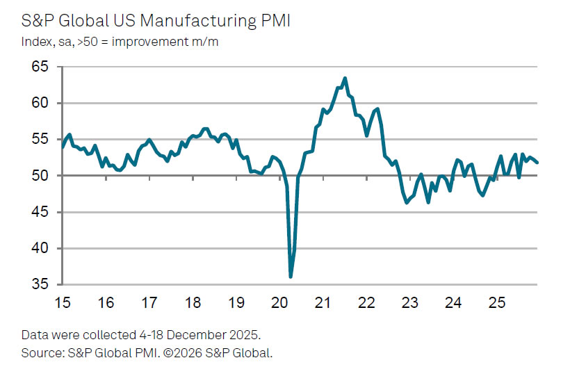 US PMI Manufacturing was finalized at 51.8 in December, easing from November’s 52.2 and marking the weakest expansion in the current five-month growth stretch. While activity remains in growth territory, the slowdown points to fading momentum as the sector heads into 2026.