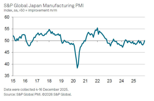 Japan’s Manufacturing PMI was finalized at 50.0 in December, rising from 48.7 in November and ending a five-month stretch of contraction. The reading points to stabilization rather than renewed expansion, but marks a clear improvement in underlying momentum as 2025 drew to a close.