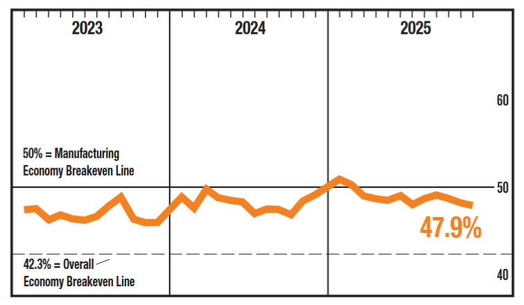 Beneath the headline, details were mixed. Production edged down from 51.4 to 51.0, remaining marginally in expansion, while new orders improved modestly from 47.4 to 47.7. Employment also ticked higher to 44.9 from 44.0, though it stayed deeply contractionary. Prices were unchanged at 58.5.