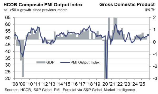 Despite the slowdown, Hamburg Commercial Bank Chief Economist Cyrus de la Rubia said the services sector has now expanded for seven consecutive months and that “the picture looks good” overall. He added that Composite PMI averaged a “visibly higher level” in the final quarter, suggesting GDP growth likely accelerated toward year-end, driven primarily by services. Growth prospects for 2026 improve modestly, with overall expansion seen above 1% but far from robust.