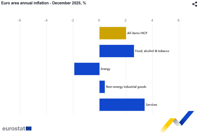 Eurozone inflation edged lower in December, with flash data showing headline CPI slowing from 2.1% to 2.0% yoy, undershooting expectations of 2.1%. Core inflation also eased, with CPI excluding energy, food, alcohol and tobacco falling from 2.4% to 2.3%, below the 2.4% consensus forecast.
