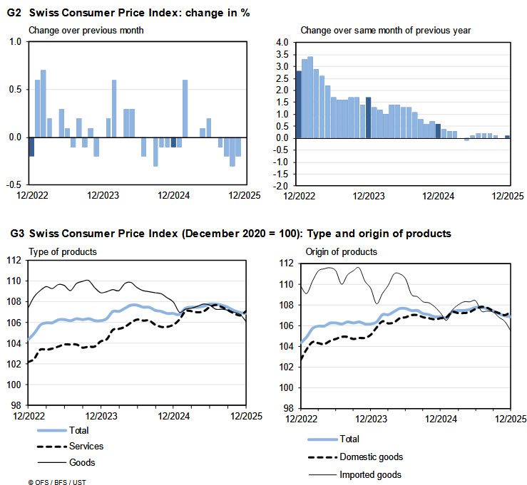 Swiss inflation remained subdued in December, with headline CPI unchanged at 0.1% yoy, in line with expectations. Core inflation edged slightly higher, ticking up from 0.4% to 0.5%, pointing to mild underlying price pressures even as overall inflation stayed close to zero.