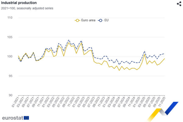 Across the wider EU, industrial production increased just 0.2% on the month. Estonia (6.0%), Lithuania (5.8%), and Czechia (2.8%) recorded the strongest gains, while Luxembourg (-7.3%), Denmark (-5.1%), and Portugal (-3.0%) posted the steepest declines.