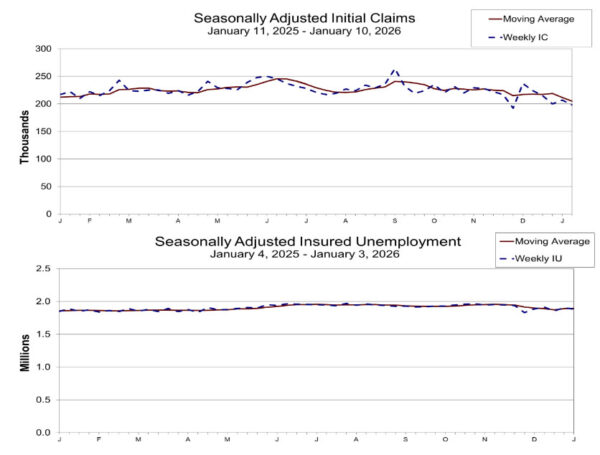 Continuing claims also edged lower, falling 19k to 1.884 million in the week ending January 3. The four-week average was broadly unchanged at 1.889 million.