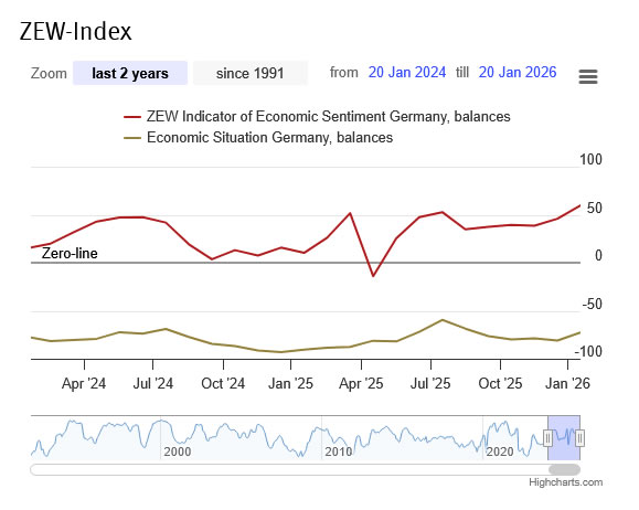 Germany’s economic sentiment strengthened sharply at the start of 2026, offering an early sign that growth momentum may be building. German ZEW Economic Sentiment Index jumped from 45.8 to 59.6 in January, well above expectations of 49.6, while Current Situation Index improved from -81.0 to -72.7, also beating forecasts.