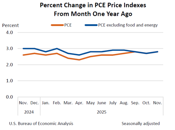 Inflation readings remained firm but controlled. The headline PCE price index rose 0.2% mom in both October and November, with the core PCE measure also increasing 0.2% mom in each month. On a year-over-year basis, headline and core PCE inflation ticked up from 2.7% in October to 2.8% in November, suggesting inflation pressures are easing only gradually.