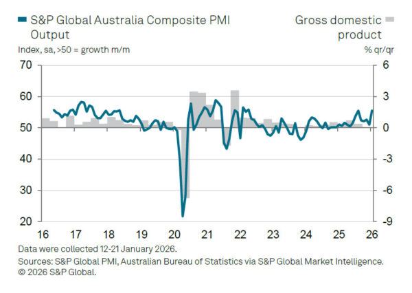 Australia’s business activity accelerated sharply in January, pointing to a strong start to 2026. PMI Manufacturing rose from 51.6 to 52.4, while PMI Services surged from 51.1 to 56.0. As a result, PMI Composite jumped from 51.0 to 55.0, marking the joint-highest level since April 2022 and signaling a broad-based expansion.