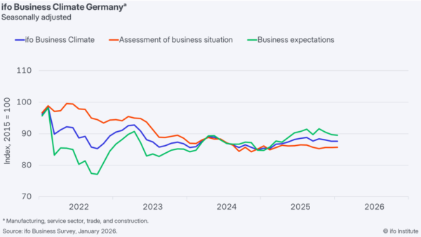 Germany’s Ifo Institute Business Climate Index was unchanged at 87.6 in January, undershooting expectations for a modest improvement to 88.3. The stagnant headline reading reinforces the view that Germany’s economy is entering the new year without meaningful traction.