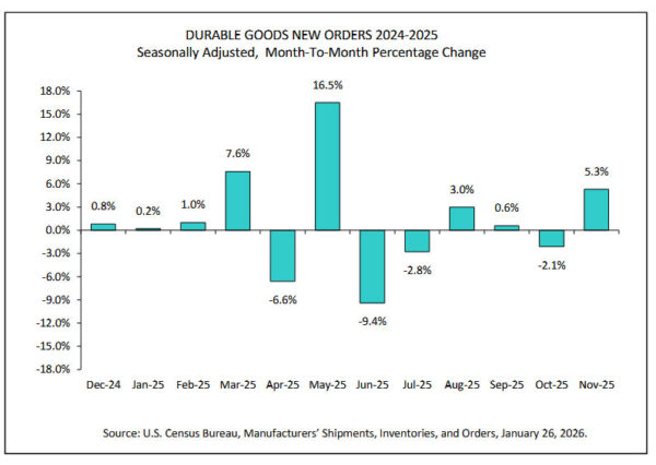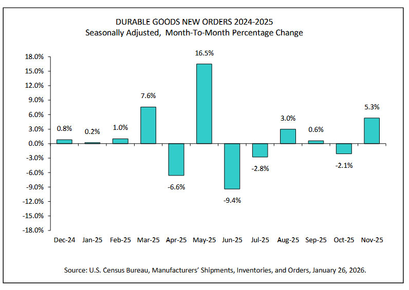 US durable goods orders surge 5.3% mom in November, led by transport strength