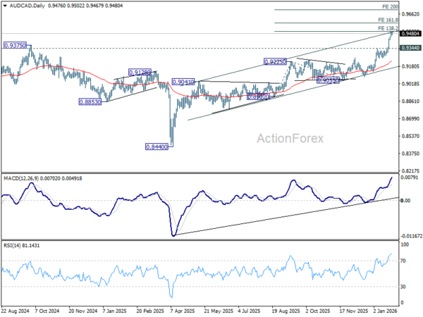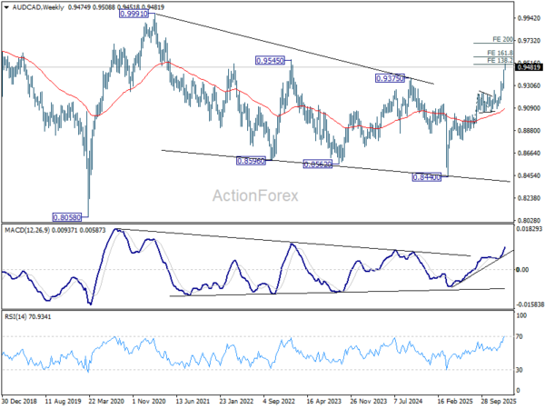 In the bigger picture, last week’s strong break of 0.9375 key resistance (2024 high) should confirm that whole down trend from 0.9991 (2020 high) has completed as a correction to 0.8440 (2025 low). There is prospect for the current up trend to extend in the medium term to have a test on 0.9991 at least.
