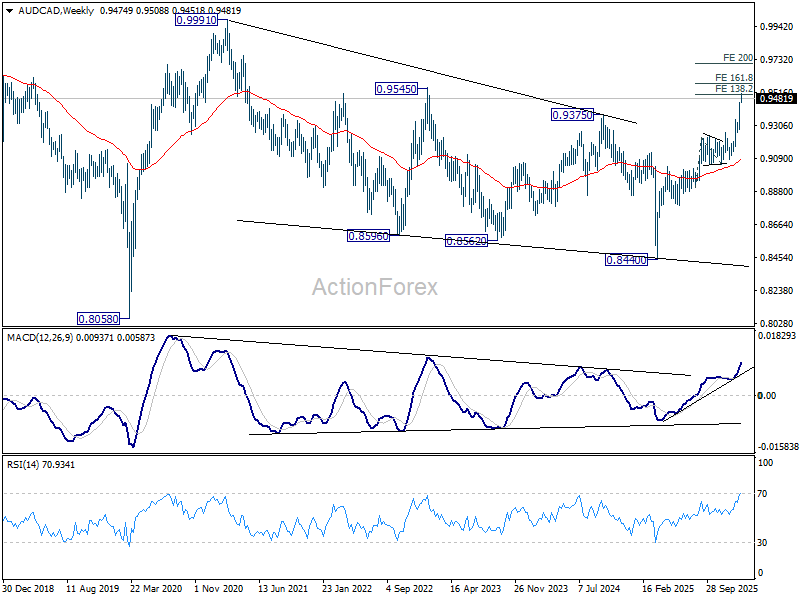 In the bigger picture, last week’s strong break of 0.9375 key resistance (2024 high) should confirm that whole down trend from 0.9991 (2020 high) has completed as a correction to 0.8440 (2025 low). There is prospect for the current up trend to extend in the medium term to have a test on 0.9991 at least.