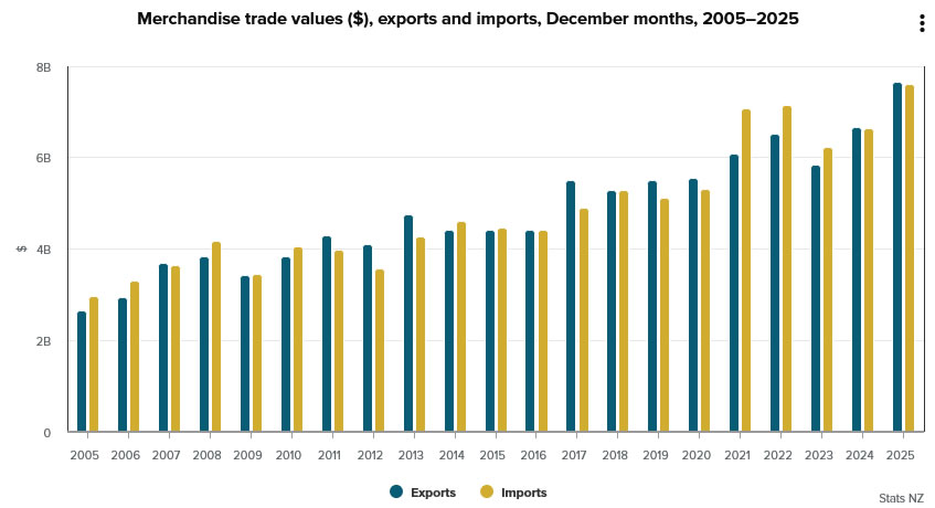 New Zealand recorded a modest but better-than-expected trade surplus of NZD 52m in December, exceeding forecasts for a NZD 40m surplus. According to Stats NZ, goods exports jumped 15% year-on-year to NZD 7.7B, while goods imports rose by a similar 15% to NZD 7.6B, reflecting strong two-way trade flows at year-end.