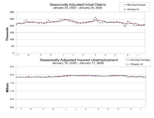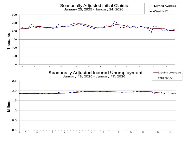 Continuing claims fell -38k to 1827k in the week ending January 17, lowest since September 21, 204. Four-week moving average of continuing claims fell -7k to 1868k.