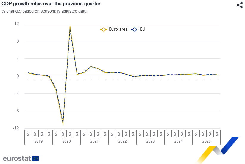 The Eurozone economy ended 2025 on slightly firmer footing, with GDP rising 0.3% qoq in Q4, modestly above expectations of 0.2%. Growth in the wider European Union matched that pace. On an annual basis, GDP expanded 1.3% yoy in the Eurozone and 1.4% yoy in the EU, easing slightly from Q3 but still consistent with a slow and uneven recovery.