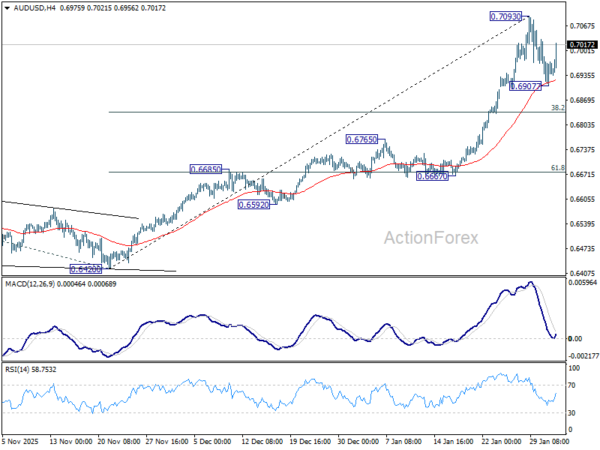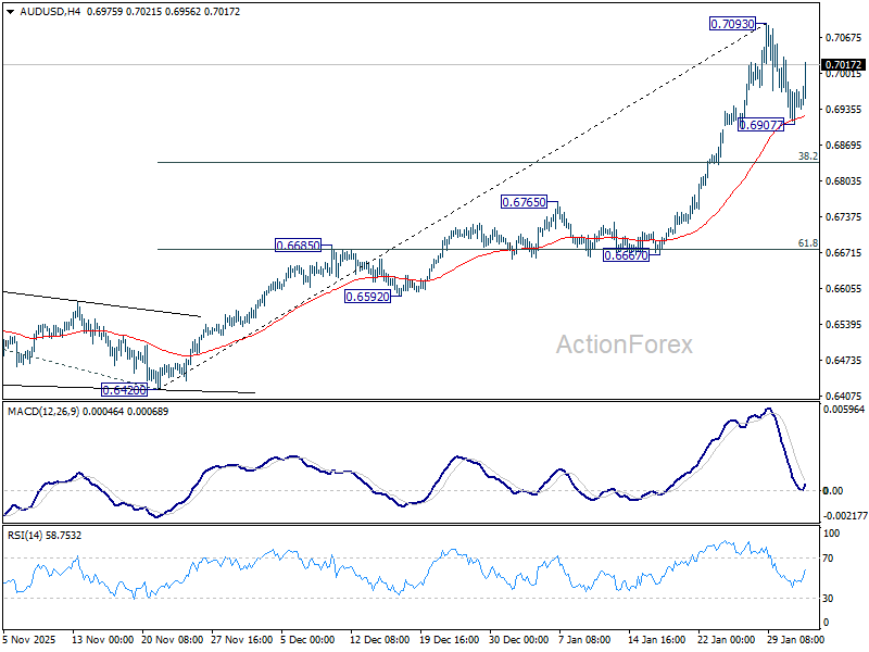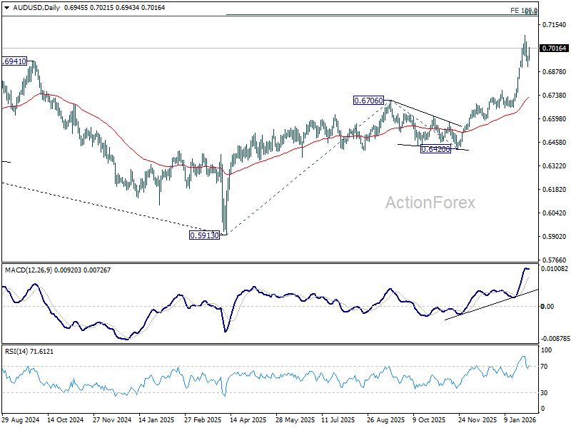 Decisive break above 0.7093 would confirm continuation of the broader uptrend from 0.5913 (2025 low). In this scenario, AUD/USD would be on track to 100% projection of 0.5913 to 0.6706 from 0.6420 at 0.7213 in the next leg higher.