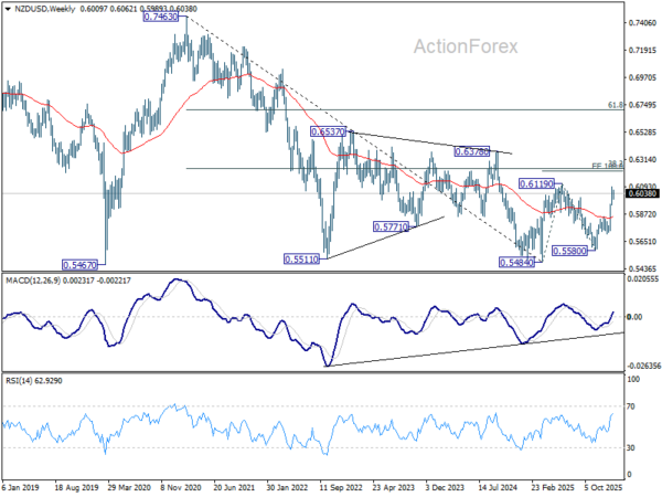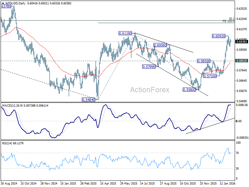 Technically, NZD/USD continues to consolidate below the 0.6092 short-term top. While a deeper pullback cannot be ruled out, downside should be contained well above 0.5852 resistance turned support. Current rise from 0.5580 is seen as the third leg of the pattern from 0.5484 (2025 low). Above 0.6092 should send NZD/USD through 0.6119 (2025 high) to 100% projection of 0.5484 to 0.6119 from 0.5580 at 0.6215.