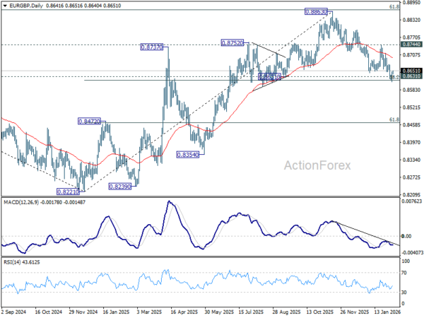 However, downside confirmation is still lacking. If EUR/GBP finds firm support around current levels and stages a convincing rebound, a break above 0.8744 resistance would suggest that the fall from 0.8863 was merely a corrective pullback. In that scenario, the rise from 0.8221 would likely be resuming, with scope to extend toward through 0.8863 towards 0.9267 in the medium term.