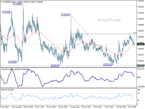 Technically, EUR/GBP is testing a critical support cluster near 0.86. The favored view is that the rebound from the 0.8221 (2024 low was corrective) and may have completed at 0.8863 after failing near 61.8% retracement of 0.9267 (2022 high) to 0.8221 (2024 low) at 0.8867. Decisive break below the 0.8631 support zone (38.2% retracement of 0.8221 to 0.8663 at 0.8618, and 55 W EMA at 0.8625) would confirm bearish reversal.
