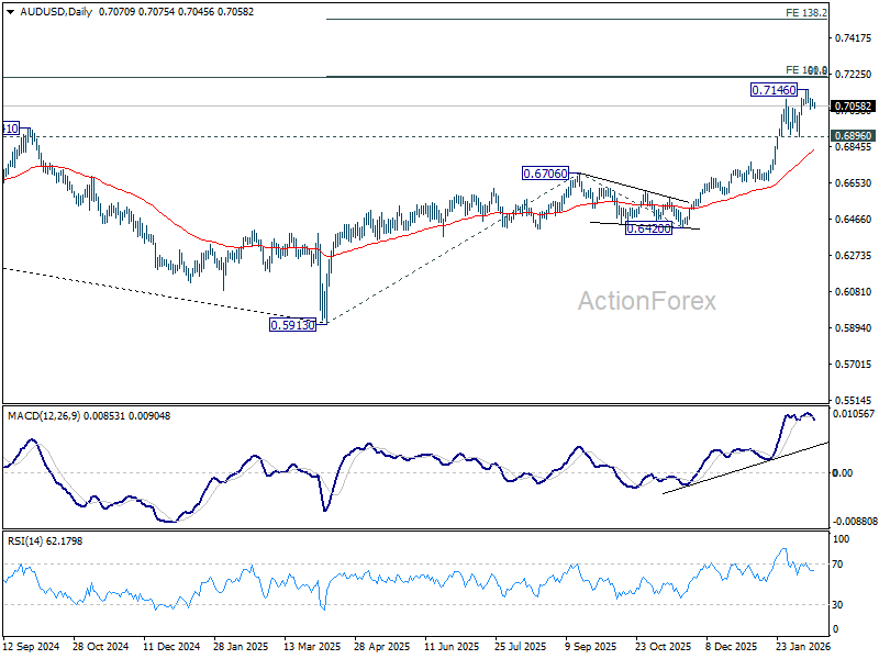 Technically, some more consolidations would likely be seen in AUD/USD below 0.7146 short term top. But downside should be contained above 0.6896 support to bring up trend resumption. The real test lies in 0.72 zone, with 100% projection of 0.5913 to 0.6706 from 0.6420 at 0.7213. Decisive break there will pave the way to 138.2% projection at 0.7516. But that break through 0.72 might need either a shift in expectations for more than one RBA hike this year, or more Fed rate cuts.