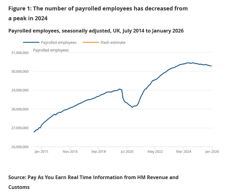 UK labor market data pointed to further cooling at the start of the year. Payrolled employment fell by -11k in January and is down -134k over the past 12 months, a -0.4% yoy decline.